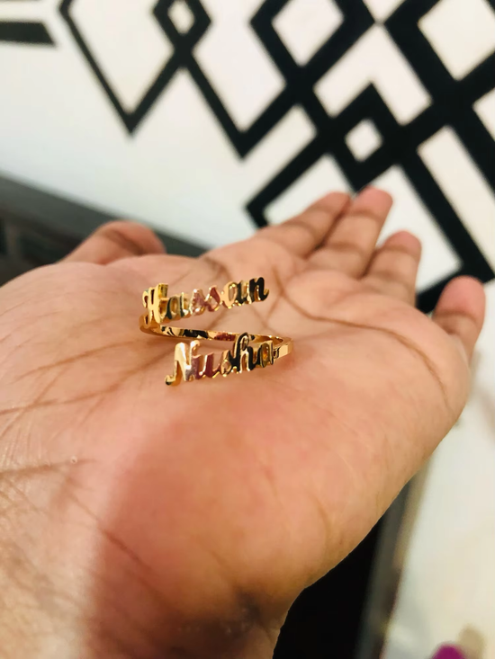 Denna anpassade ring är underbar! Jag älskar att kunna bära namnen på mina nära och kära samtidigt som jag har ett elegant och unikt smycke. Designen är modern och sofistikerad!