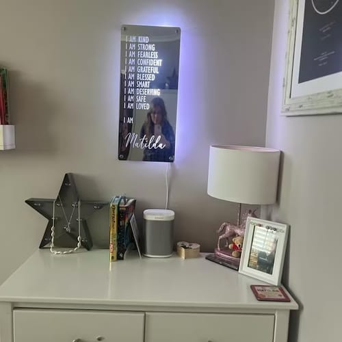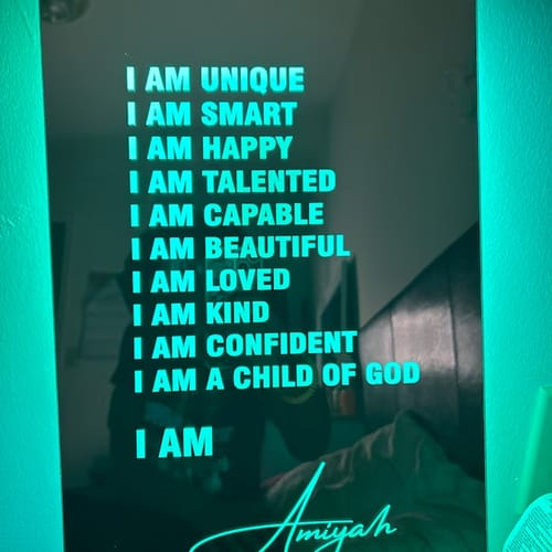 "Jag älskar att kunna anpassa mina egna affirmationer på denna spegel, det ger en unik touch till min rutin!"